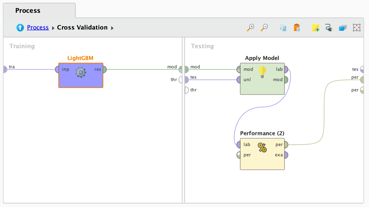 - 이전 프로젝트에서 정의한 대로, 이번에는 Cross Validation 안에 오퍼레이터로 저장된 상태를 추가하고 연결했습니다.