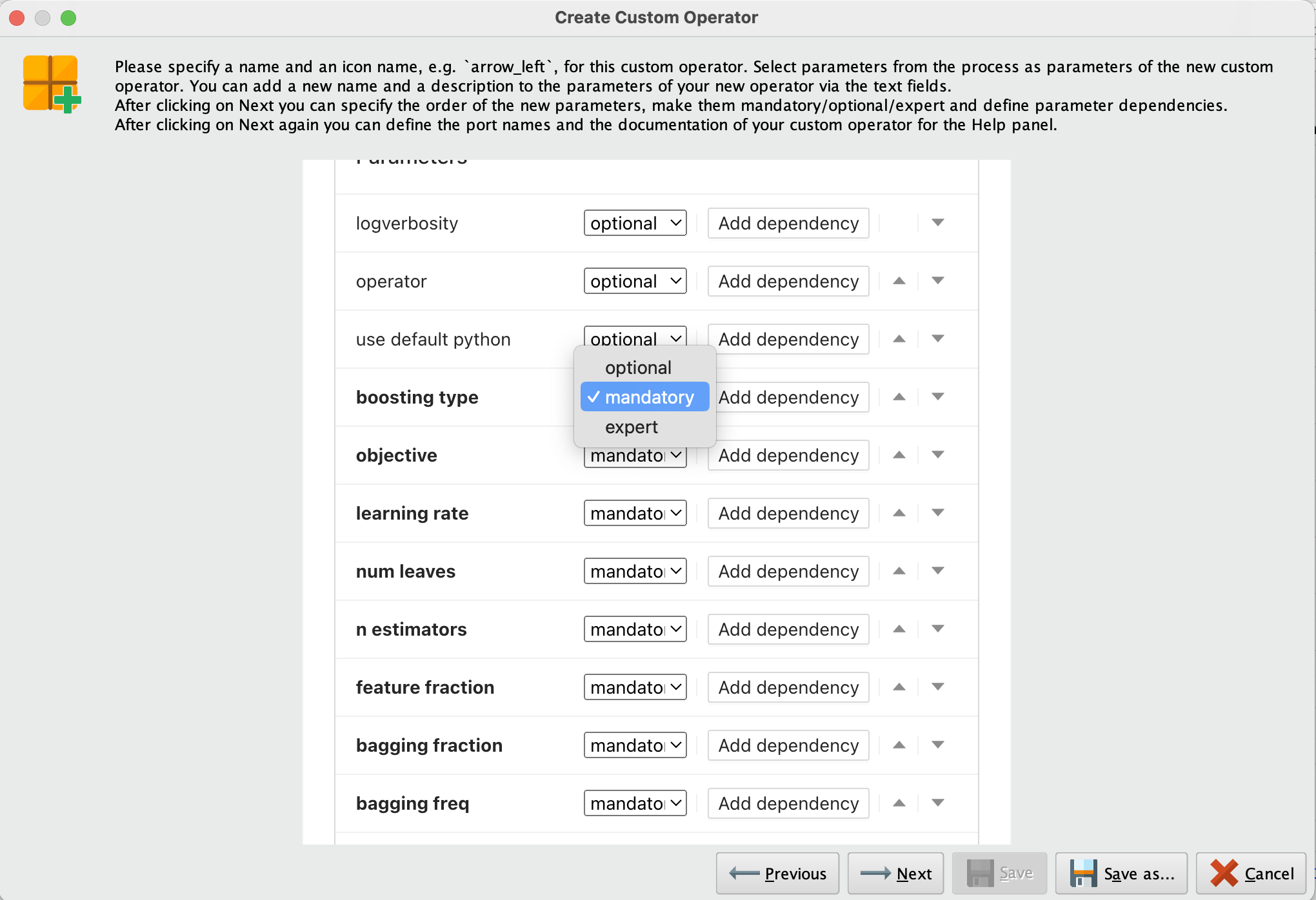 - 그런 다음 나타나는 화면에서 매개변수의 필수 여부를 설정하거나 종속성을 추가할 수 있습니다. 저는 모든 매개변수를 필수(mandatory)로 설정했습니다.