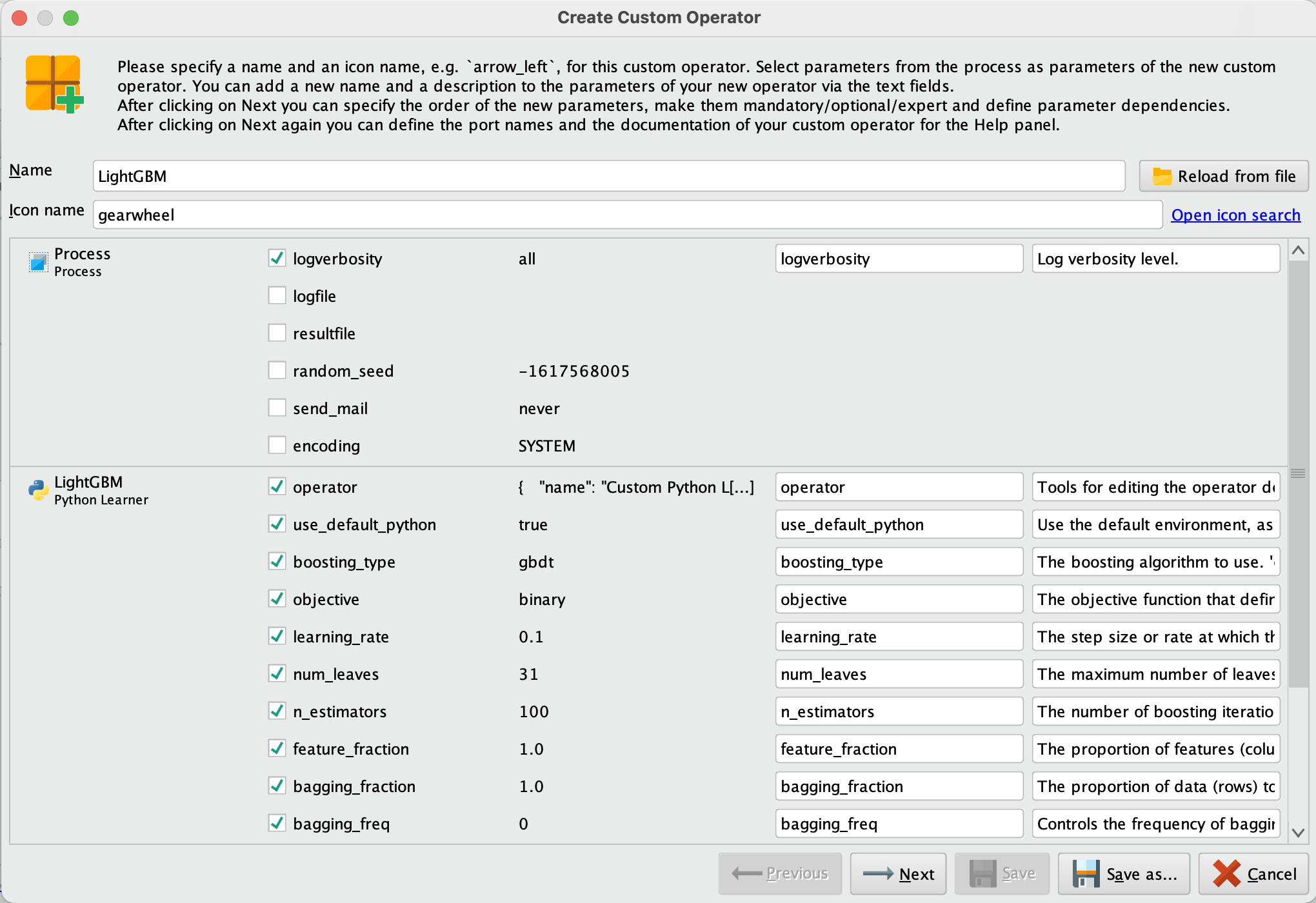 - 클릭한 후에는 다음과 같은 화면이 나타납니다. 여기에서 오퍼레이터의 이름과 원하는 경우 아이콘 이름을 입력하고, 아래에서 오퍼레이터에 대해 어떤 매개변수를 설정할지를 선택합니다. 그런 다음 "Next"을 클릭합니다. 저는 "gearwheel"이라는 아이콘을 선택하여 입력했어요.