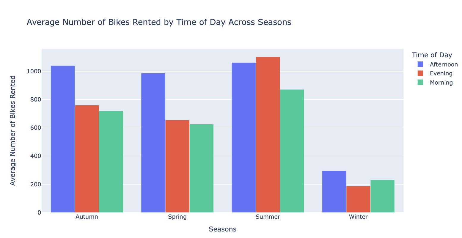 title='Average Number of Bikes Rented by Time of Day Across Seasons',