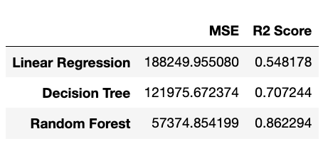 - 그 다음에 세 가지 머신러닝 모델(선형 회귀, 결정 트리, 랜덤 포레스트)을 정의하고, 각 모델에 대해 학습 및 성능 평가를 수행하겠습니다.