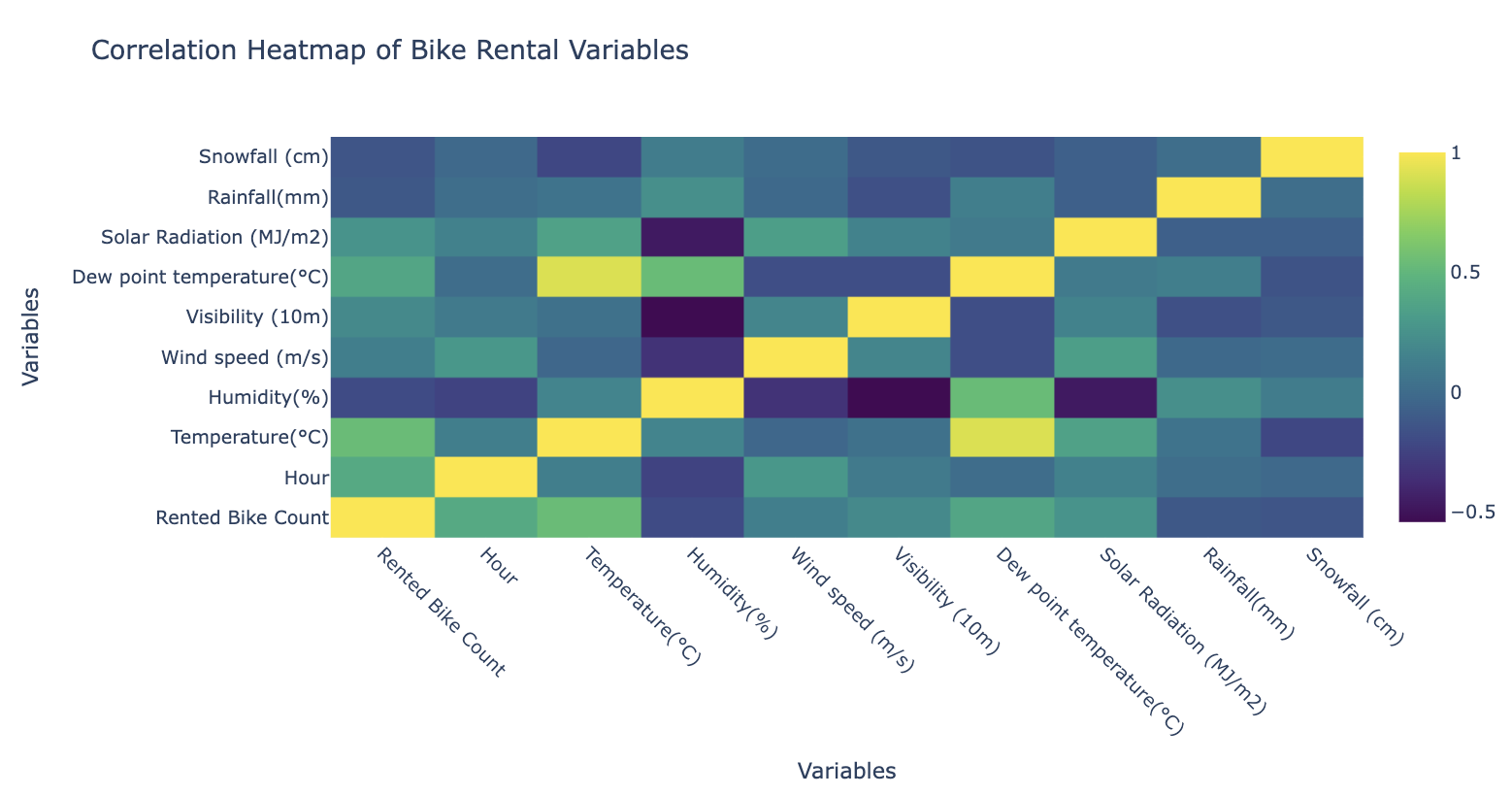 - 이 상관관계 결과를 바탕으로 "대여 자전거 수(Rented Bike Count)"와 다른 변수들 간의 관계를 분석할 수 있습니다. 결과는 대여 자전거 수가 특히 온도와 시간과 같은 변수에 의해 어떻게 영향을 받는지를 보여줍니다. 또한, 날씨 조건(비, 눈)과 같은 요인들도 대여 행동에 중요한 영향을 미칩니다. 이러한 분석은 자전거 대여 서비스를 제공하는 회사들이 전략적 결정을 내리는 데 유용할 수 있으며, 예를 들어, 더운 날에는 프로모션을 진행하거나 비 오는 날에는 대여 시간을 줄이는 등의 방법을 고려할 수 있습니다.
