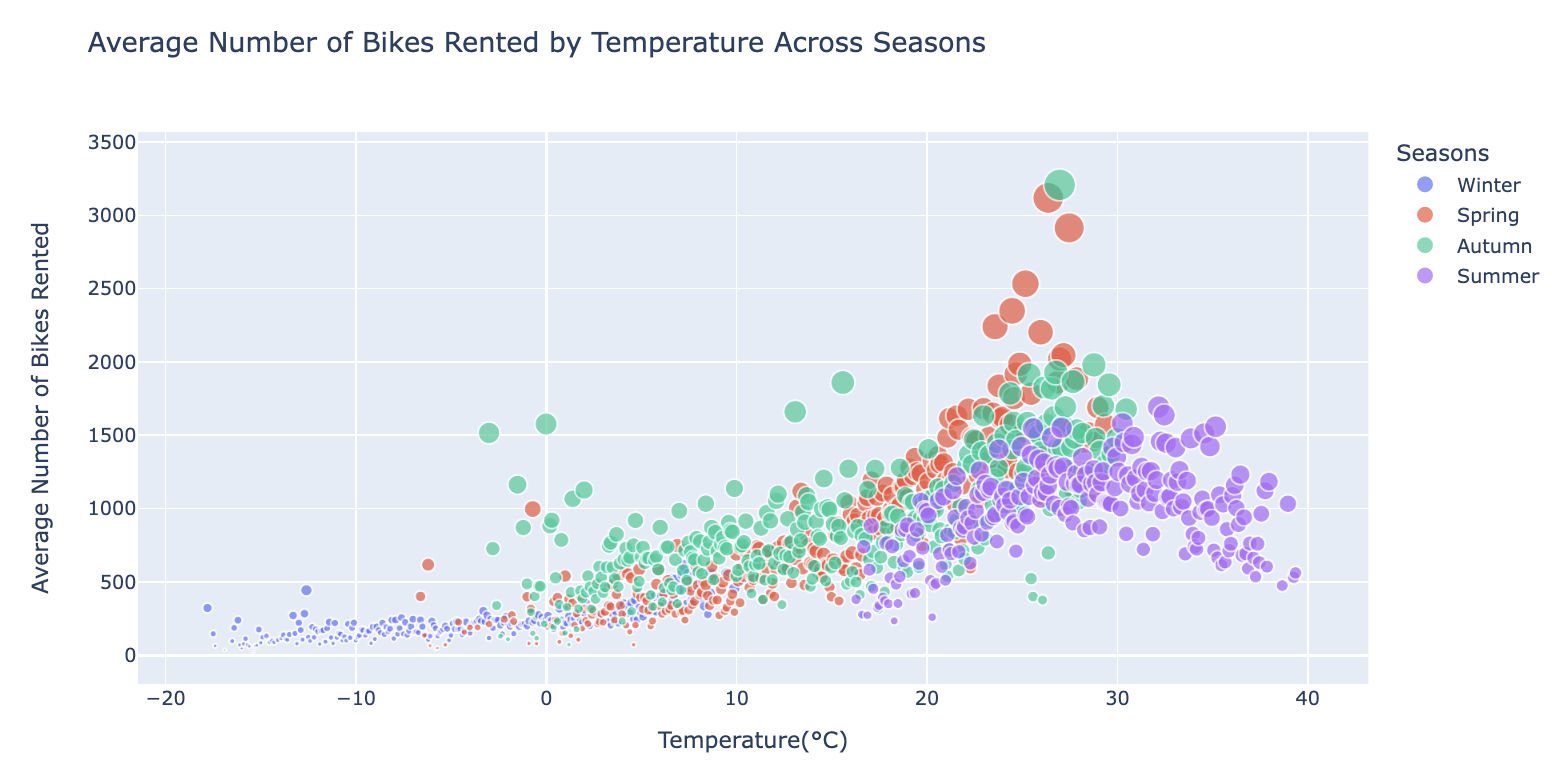 title='Average Number of Bikes Rented by Temperature Across Seasons',