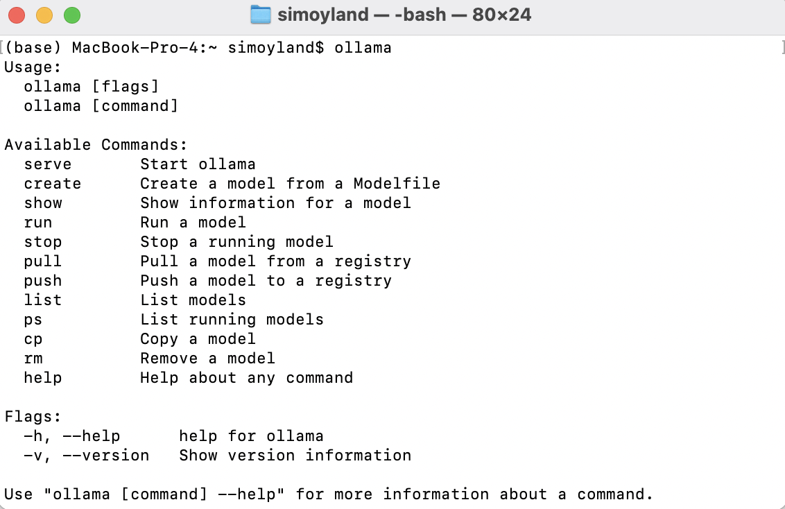 4. 이제 터미널을 켜서 "ollama" 명령어를 입력해요. 이 명령어로 Ollama가 제대로 다운로드되었는지 확인할 수 있어용!