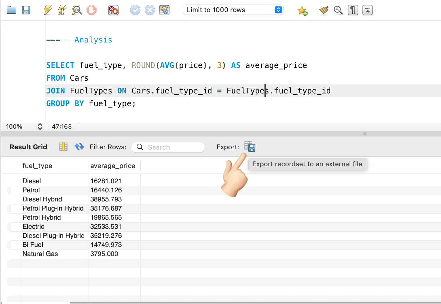 이후, 이 결과를 Tableau에서 시각화할 것입니다. 이를 위해 SQL 쿼리를 실행한 후, 오른쪽에 있는 내보내기(Export) 아이콘을 클릭하여 데이터를 저장합니다. 저는 데이터를 CSV 파일 형식으로 저장했습니다.