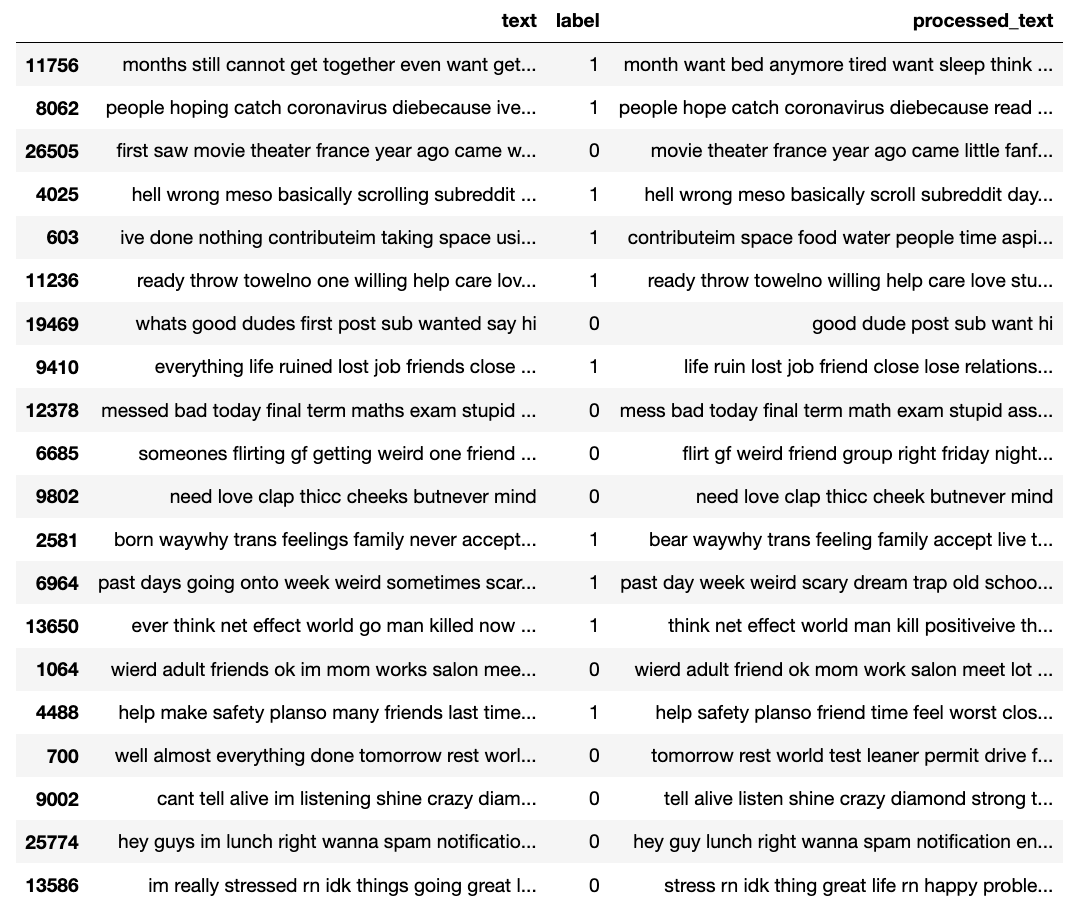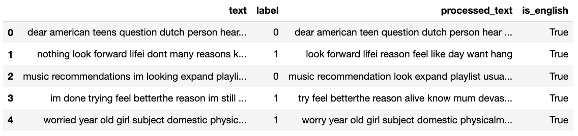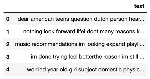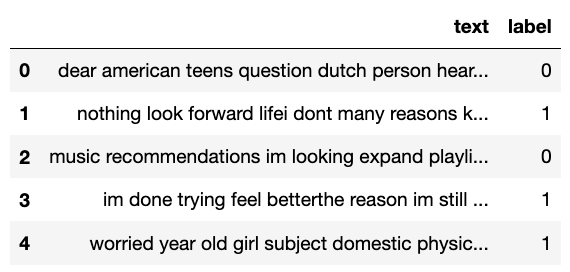 - 두 개의 열로 구성되어 있음. 첫 번째 열은 텍스트 데이터, 두 번째 열은 해당 텍스트가 정신 건강 문제와 관련이 있는지를 나타내는 레이블 (레이블이 1이면 관련 있음, 0이면 관련 없음)