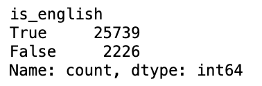 - "langdetect" 패키지를 사용하여 영어 텍스트만을 분석 대상으로 유지하였음. 그 결과, 2,226개의 비영어 텍스트가 제거되어, 최종적으로 25,739개의 항목이 남았음