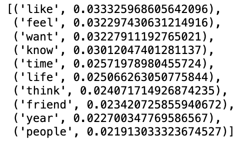 - 토픽 확률(topic probabilities)에 이 방식으로 접근할 수 있는데, 이는 모델을 생성할 때 미리 설정한 `calculate_prob=True` 파라미터 덕분입니다.