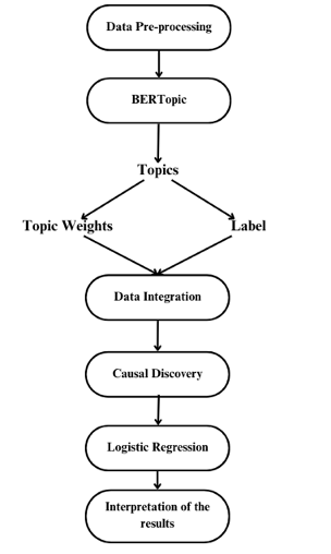 - 연구 절차는 다음과 같습니다. 먼저 데이터 전처리(Data Pre-processing)를 통해 데이터를 정리한 후, BERTopic 모델을 사용하여 토픽을 추출합니다. 추출된 토픽과 데이터의 라벨(Label) 열을 기반으로 토픽 가중치(Topic Weights)를 계산하고, 이를 데이터 통합(Data Integration) 단계에서 결합합니다. 이후, 인과 발견(Causal Discovery)을 통해 변인 간의 관계를 분석하고, 로지스틱 회귀(Logistic Regression)를 사용하여 예측 모델을 구축합니다. 마지막으로 분석 결과를 해석합니다.