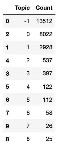 앞서 언급한 것처럼, 토픽 -1은 이상값(outliers)이기 때문에 제외합니다.